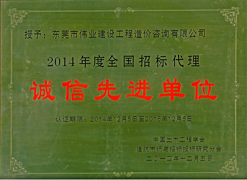 2014年全国招标代理机构诚信先进单位